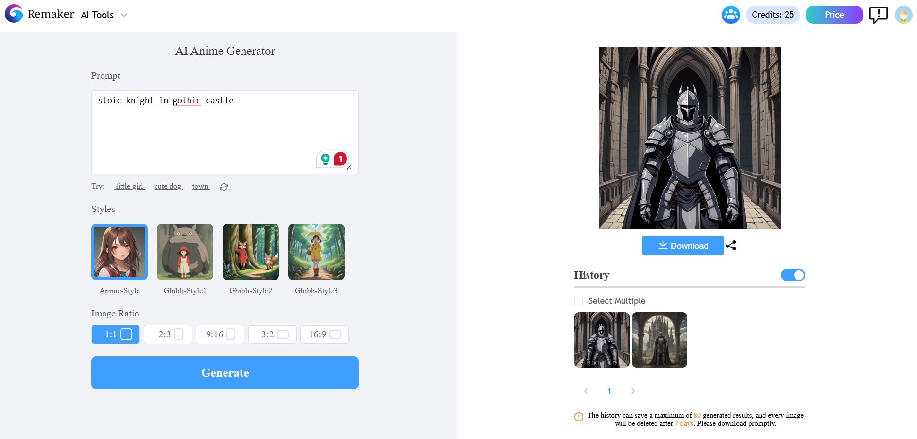 The anime generator is really entertaining. Add a text prompt to specify the required style: shonen, cyberpunk mecha, slice-of-life, etc. The tool will create a stylized image. We tried prompts such as “stoic knight in gothic castle” and received similar results that were usable, such as minimalistic anime character design, pastel colors.