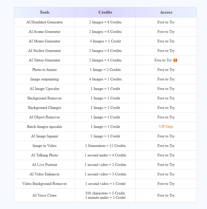 Each task normally costs a credit. One credit is used in scaling an image. Creating an anime portrait is one credit. Video assignments can be charged 2-3 credits depending on length. This low pricing makes you aware of the price upfront.