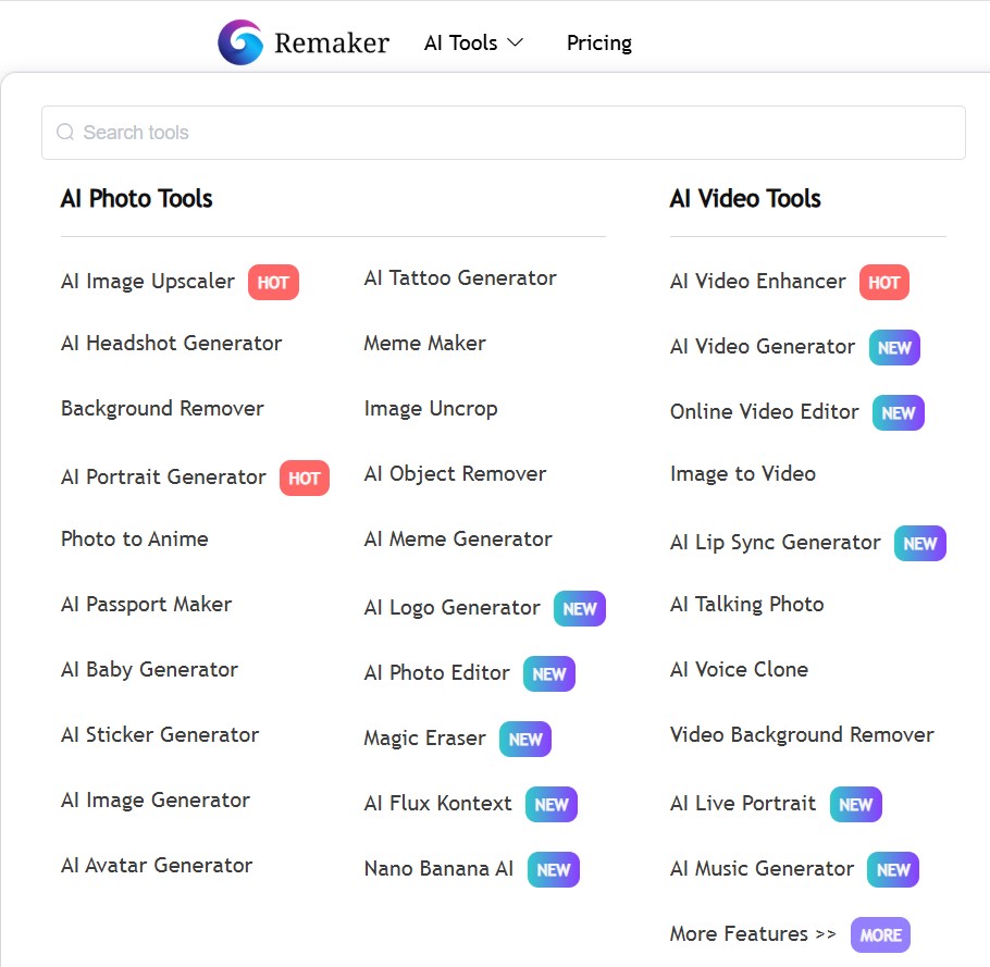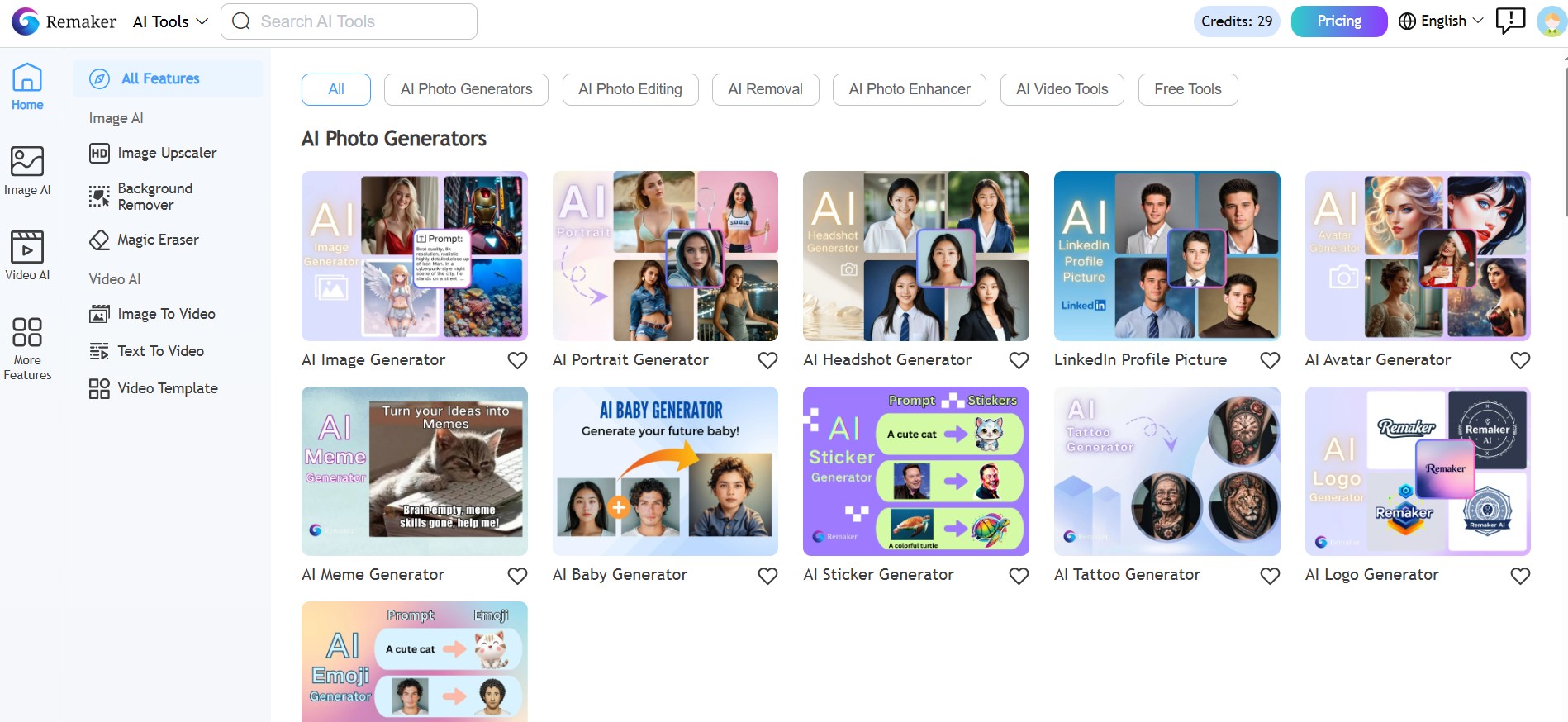 There are two categories of AI-powered tools for Remaker AI users – AI photo tools and AI video tools. About 40 tools are available for use – some are free, while others are cost-effective. Let’s review some of the greatest Remaker AI tools.