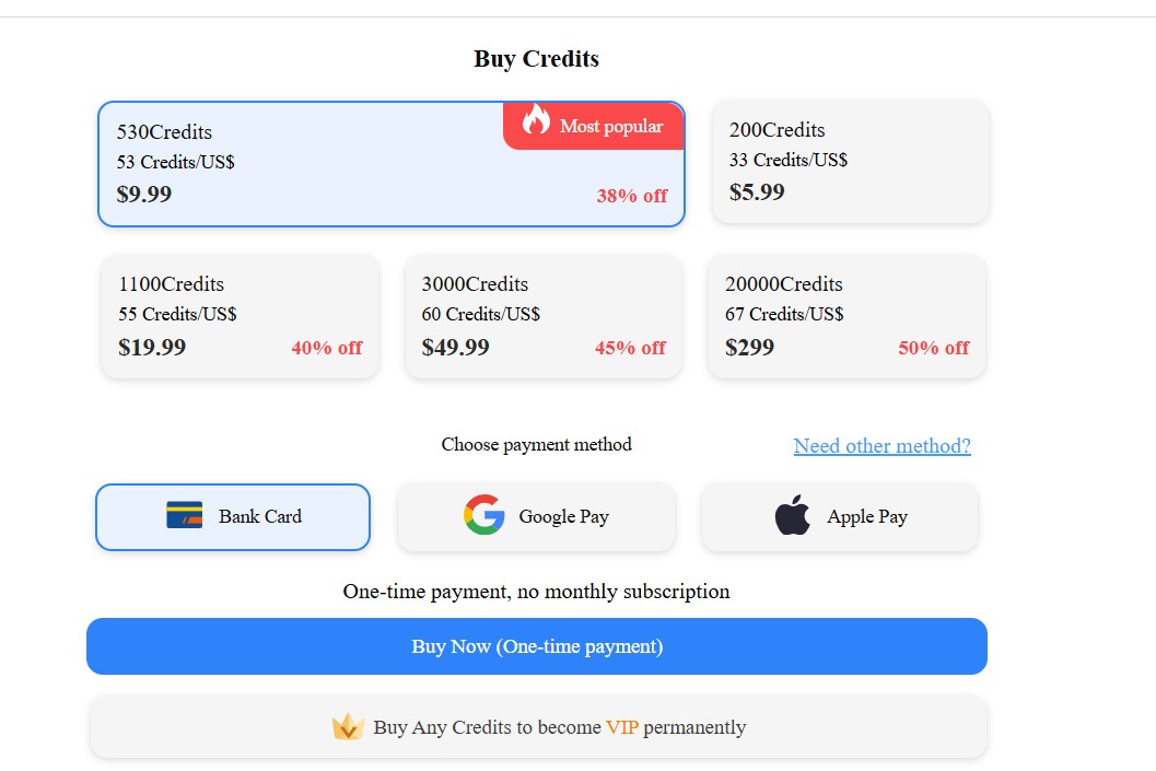 This platform, with multiple tools, works on credits as opposed to a subscription. That approach changes how you use it. There’s no hidden meter or expensive subscriptions. You do not feel guilty using these multiple tools on the AI-based editing platform since you have already purchased credits. You can buy credits whenever you need them, use them when you feel inspired, and they do not run out within a month (like on most other platforms, sites, and services). That is quite consumer-friendly in 2025.