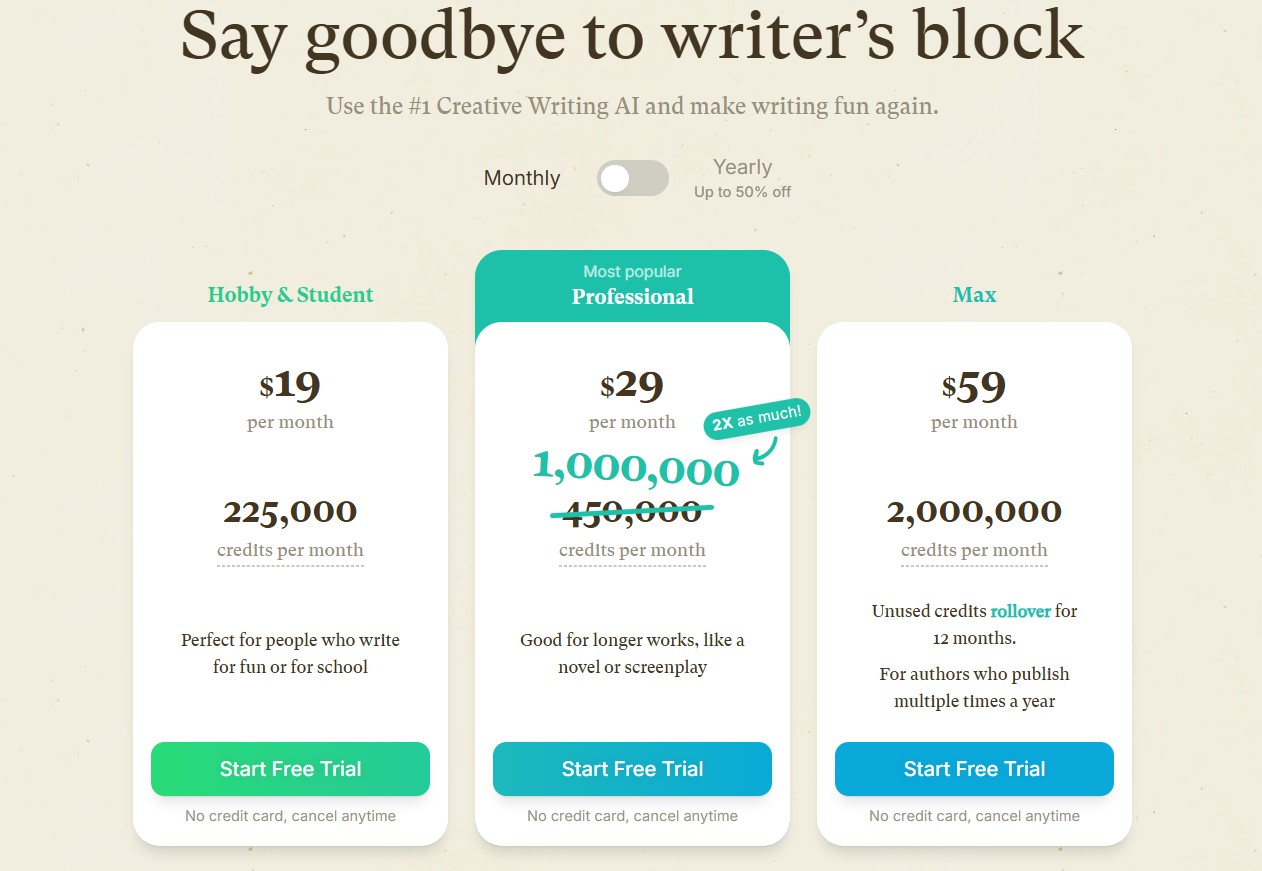 | Professional | $22 | 1,000,000 | Regular novelists, screenwriters, and consistent weekly work. |
