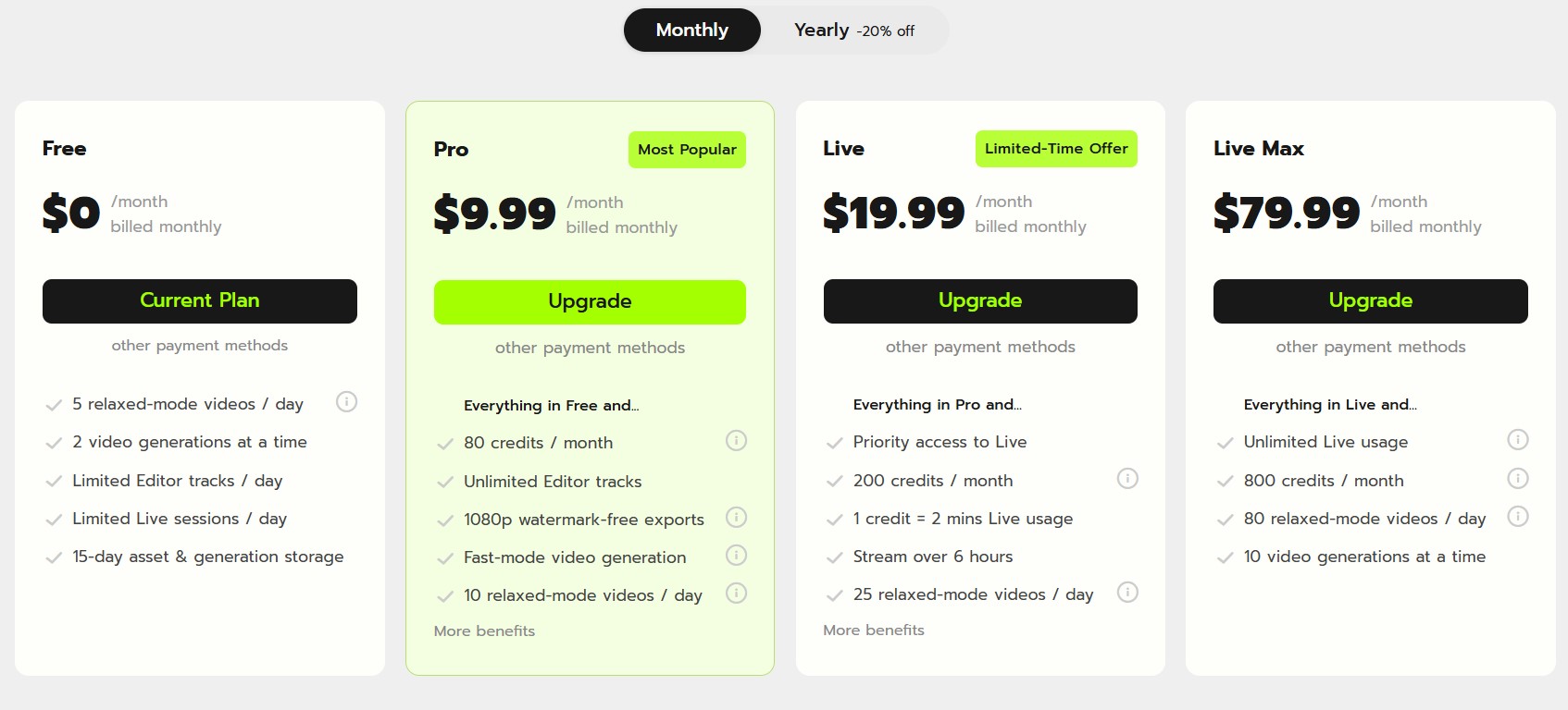 | Live Max | $79.99 | 800 credits/month, Extensive Live usage, 1080p watermark-free exports, Maximum simultaneous generations. |